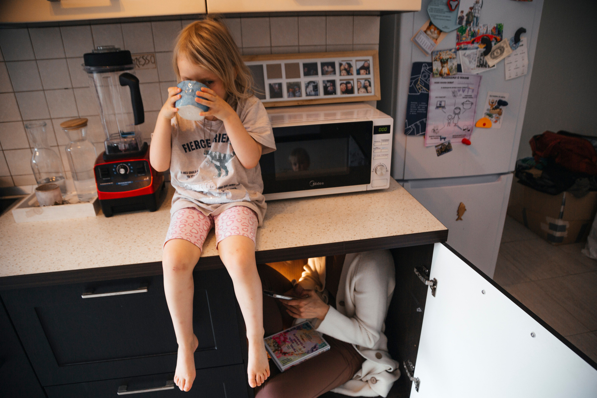 Я люблю снимать репортажи, и в этот раз вышло так же, но с юмором. Мы придумывали места, где можно было бы спрятаться и поработать в тишине или просто отдохнуть. Но ее дочь Забава все время хотела быть рядом с мамой. Она в буквальном смысле сваливалась на голову Наташе. Это мы, конечно, не планировали, но вышло очень символично. В итоге вся съемка получилась ироничная и жизненная. По сути это рассказ и о моей собственно жизни сейчас. Этим проектом я бы хотела напомнить всем мамам: отдых, конечно, необходим! Но не менее важно уметь иронизировать над происходящим и замечать, ценить в моменте ту ответную любовь и нежность, которую дарят нам наши дети.